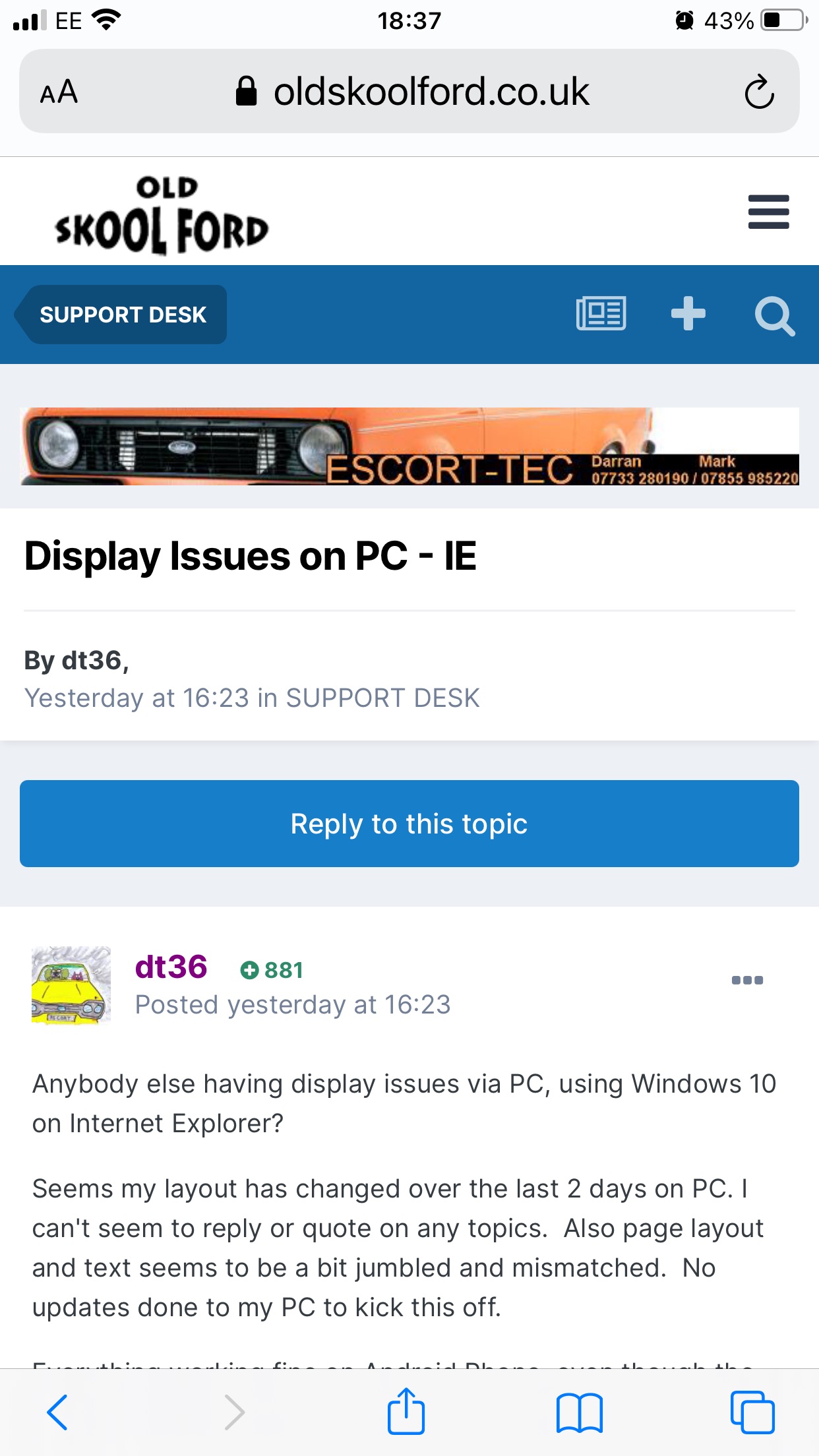 DT36 Posted October 8, 2020 Report Posted October 8, 2020 Anybody else having display issues via PC, using Windows 10 on Internet Explorer? Seems my layout has changed over the last 2 days on PC. I can't seem to reply or quote on any topics. Also page layout and text seems to be a bit jumbled and mismatched. No updates done to my PC to kick this off. Everything working fine on Android Phone, even though the page layout seems to have had some updates.